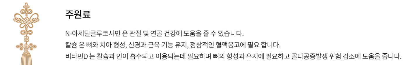 주원료 MSM은 관절 및 연골 건강에 도움을 주며, 부원료인 홍삼농축액(RG3 + COMPOUND K)로 되어있습니다.