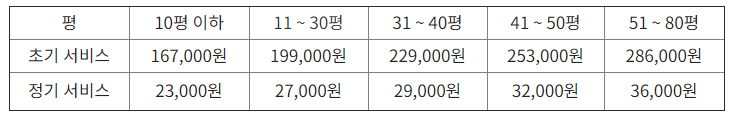 위에서 알아본 내용은 평균적으로 10평, 20평, 30평 등등 초기, 정기 서비스에 대한 내용을 알아보았으며 보다 정확한 견적을 알아보기 위해서는 무료 진단 견적 신청하여 본인 집의 견적을 받아보는게 정확합니다.