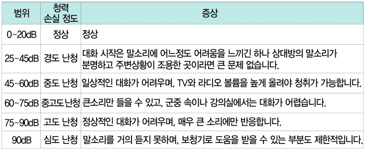 장애등급 5급 : 두 귀의 청력 손실이 각각 60db 이상인 사람